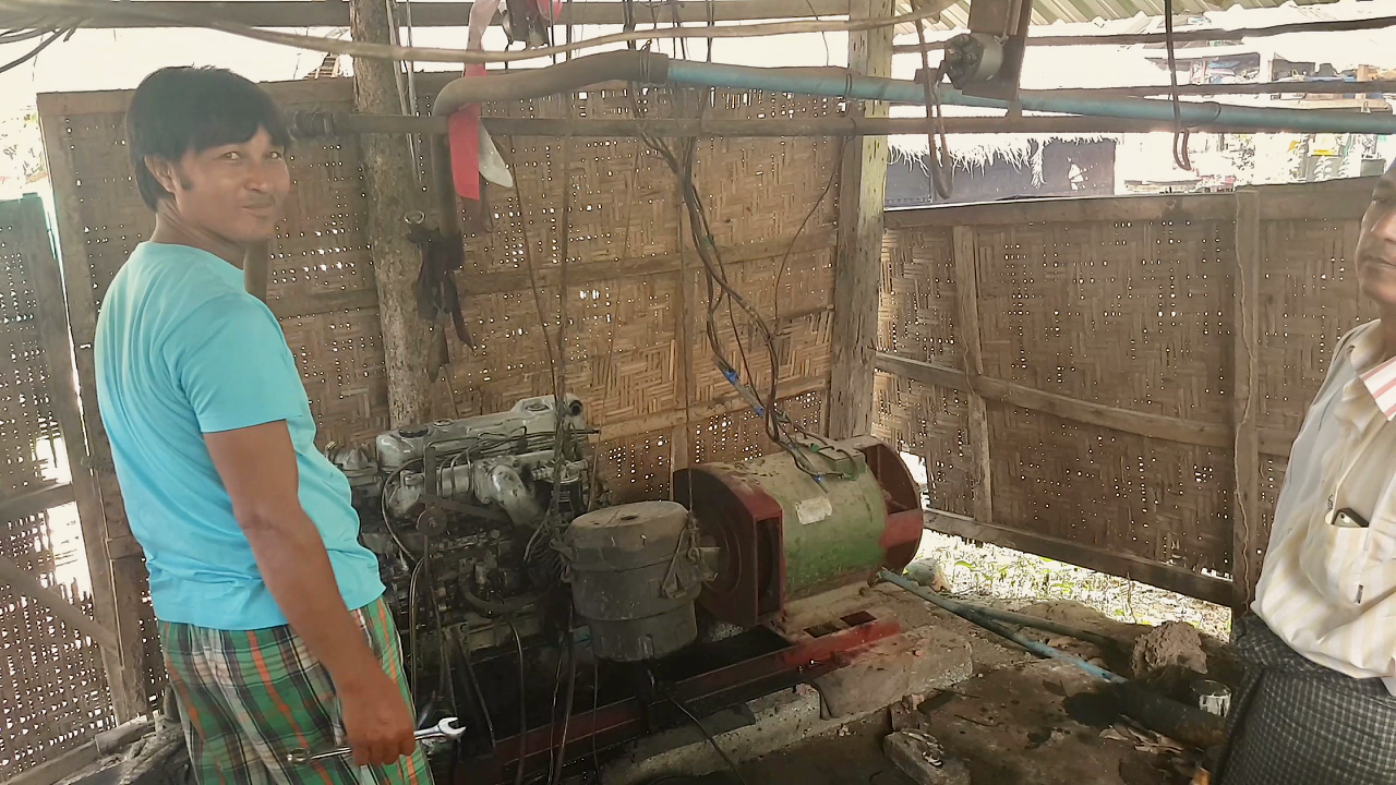 Aung Moe Win proudly showing off his generator as he gives us a tour of the mini-grid. Every night at 6 PM, he turns it on with the crank of a wrench, providing basic but necessary lighting and charging to his community.